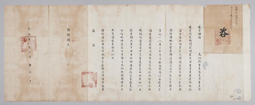 Keywords: 조선-청 외교문서(자문) 337.jpg 고종 29년 1892 3월 16 에 청국 예 에 조선국왕에게 보내 온 문 올해 하계 통 에 내성 협령 영 榮恩 파견 다고 알리는 내용 다 통 기는 4월 8 터 6월 15 까 다 2016-07-20 http //www nl go kr/nl/search/SearchDetail nl category_code ct service KOLIS vdkvgwkey 1130278 colltype DAN_OLD place_code_info 172 place_name_info EB 94 94 EC A7 80 ED 84 B8 EC 97 B4 EB 9E 8C EC 8B A4 manage_code MA shape_code B refLoc null category srchFlag Y h_kwd E5 8F A4 E6 9C 9D51- EB 8B A428-465 lic_yn N mat_code RB 국립중앙도 조선국왕 청국예 other versions PD-Art Books from National Library of Korea Books from Korea 1892 in Relations of the Joseon Dynasty and the Qing Dynasty |