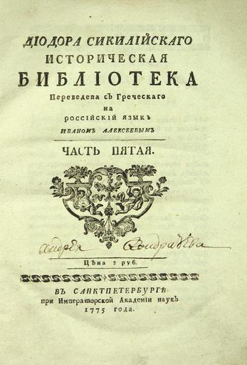 | Keywords: Диодор Титул.jpg ru Титульный лист книги Диодо а Сикилийсаго Исто ическая библиотека 1775 Книга Диодо а Сицилийскаго Исто ическая библиотека Пе еведена иваном Алексеевым СПб 1775 Диодо Сицилийский / Издательство Импе ато ской Академии аук PD-RusEmpire Books by Diodorus Siculus Books from Russia 1775 Books published in Saint Petersburg |