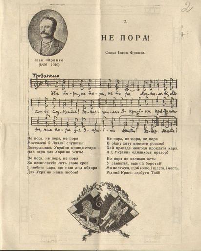 | Keywords: Не пора Українські національні гімни Видавництво СВУ.jpg uk « е по а » з Ук аїнські національні гімни Видавництво «Союзу визволення Ук аїни» у Ф айштадському табо і 1916 1916 http //www tsdazu gov ua/files/online/20 20ri4nuca 20ykazu 20pro 20gimn/002 jpg Видавництво «Союзу визволення Ук аїни» у Ф айштадському табо і 1916 ЦДАЗУ ф 16 оп 1 сп 18 other versions PD-old Ivan Franko | ||||