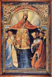 | Keywords: Перша пол. XVIII ст. Київщина. Дошка липова, левкас, темпера, олія, різьблення, сріблення, позолота. 109 х 76 х 4 (в обрамленні). The Intercession with the portrait of Hetman Bohdan Khmelnytsky. The first half of the 18th c. Kyivshchyna. Tempera, oil, silvering, gilding on three-piece lime-wood panel, carving. Національний художній музей України. Альбом. Київ, "Артанія Нова", 2003. icon | ||||