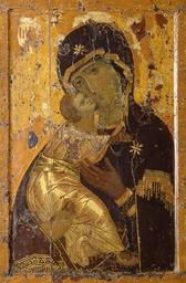 | Keywords: XII ст., Третьяковська галерея, Москва. ...У Києві XII ст. здобули популярність кілька видів Богородичних ікон, особливо Пирогощська та Вишгородська, що стали реліквіями. Вишгородська (візантійська ікона початку XII ст., відома на Русі з 1155 р.) - Елеуса, яка дістала назву "Богоматір Милування", - це скорботна мати в тісних обіймах з сином, що пригортається своєю щокою до щоки сина. Привезені візантійські ікони, зокрема шедевр "Вишгородське милування", спонукали до оплечних зображень і психологічного навантаження образів. Тема Елеуси-милування, як і Оранти, стали глибоконародними. Д.П. Крвавич, В.А. Овсійчук, С.О. Черепанова - Українське мистецтво, т.2, Львів, "Світ", 2004. - с. 155. Існує також версія, згідно якої ця ікона не була привезена з Візантії, а створена в Києві (авторство приписується Аліпію). Ікона була таємно вивезена з Вишгорода Андрієм Боголюбським: "Была в Вышгороде в женском монастыре икона Св. Богородицы, привезённая из Цареграда, писанная, как гласит предание, Св. евангелистом Лукою. Рассказывали о ней чудеса, говорили, между прочим, что, будучи поставлена у стены, она ночью сама отходила от стены и становилась посреди церкви, показывая как будто вид, что желает уйти в другое место. Взять её явно было невозможно, потому что жители не позволили бы этого. Андрей задумал похитить её, перенести в суздальскую землю, даровать таким образом этой земле святыню, уважаемую на Руси, и тем показать, что над этою землёю почиет особое благословение Божие. Подговоривши священника женского монастыря Николая и диякона Нестора, Андрей ночью унёс чудотворную икону из монастыря и вместе с княгинею и соумышленниками тотчас после того убежал в суздальскую землю." - Н. Костомаров. |