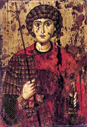 | Keywords: Київська ікона, XI ст. Успенський собор Московського Кремля. ...Близькими за часом створення, пластично-лінійним вирішенням і монументально-епічним характером до "Богоматері Великої Панагії" є ікони великих розмірів - "Георгій-воїн", "Димитрій Солунський", "Благовіщення". Ікона "Георгій-воїн", ймовірно, створена як храмова для георгіївського собору - патронального храму Ярослава Мудрого. Храм освятив митрополит Іларіон у 1051 р. Створення ікони св. Георгія варто віднести до середини XI ст., де епічність, монументальність, масивність постаті мають відповідність в образному ладі Софії Київської. ... В образі воїна простежуються глибокі патріотичні ідеї Іларіона, що знайшли втілення у його "Слові про закон і благодать". Тому Георгій в іконі поданий не мучеником, а ідеальним воїном, сповненим оптимізму і мужності. Його образ став наче емблемою князювання Ярослава. Д.П. Крвавич, В.А. Овсійчук, С.О. Черепанова - Українське мистецтво, т.2, Львів, "Світ", 2004. - с. 156, іл. 204. |