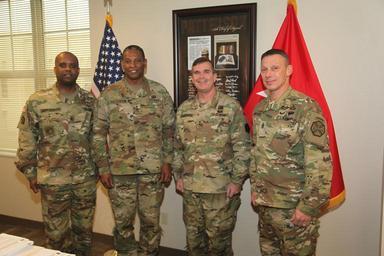 | Keywords: Maj. Gen. Thomas C. Seamands, commanding general, U.S. Army Human Resources Command and Command Sgt. Maj. Wardell Jefferson, command sergeant major of the U.S. Army Human Resources Command, visited IMCOM headquarters for meetings with Maj. Gen. Lawarren Patterson, IMCOM deputy commanding general and chief of staff, and IMCOM Command Sergeant Major Jeffrey Hartless, Jan. 6, 2016. Also attending were IMCOM G1 Sgt. Maj. Culbreath and the U.S. Army North G1 Sgt. Maj. Bowens. U.S. Army IMCOM photos by Neal Snyder. |