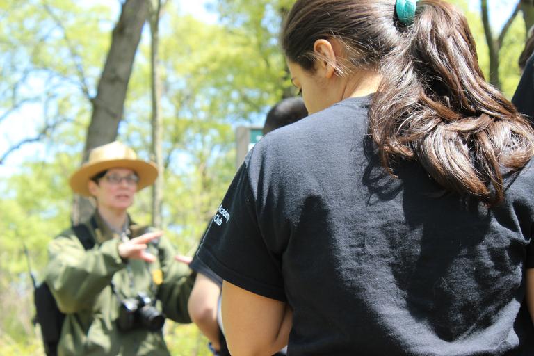 Keywords: outdoor Students inspect their surroundings as Ranger Kim Swift talks. Students inspect their surroundings as Ranger Kim Swift talks.