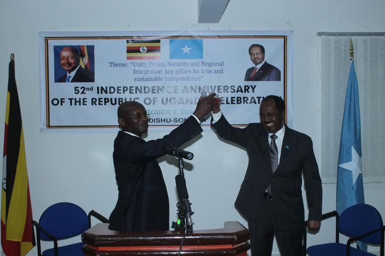 Keywords: Somali President, Hassan Sheikh Mohamud, toasts Uganda with the country's Ambassador to Somalia, Maj. Gen. Nathan Mugisha, during the celebration of Uganda's 52nd anniversary of independence on October 9, 2014. AMISOM Photo / Abdi Dagane Somali President, Hassan Sheikh Mohamud, toasts Uganda with the country's Ambassador to Somalia, Maj. Gen. Nathan Mugisha, during the celebration of Uganda's 52nd anniversary of independence on October 9, 2014. AMISOM Photo / Abdi Dagane |