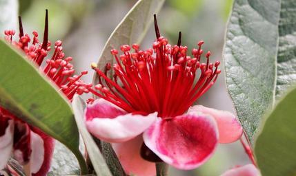 | Keywords: plants blooms trees nature red green flowers stamemens fruit flower plant the beautiful Fejoa bloom: Acca sellowiana Acca sellowiana, a species of flowering plant in the myrtle family, Myrtaceae, is native to the highlands of southern Brazil, eastern Paraguay, Uruguay, northern Argentina, and Colombia.[1] It is widely cultivated as a garden plant and fruiting tree. Common names include feijoa (/feɪˈʒoʊ.ə/, /feɪˈdʒoʊ.ə/,[2] or /feɪˈhoʊ.ə/),[3] pineapple guava and guavasteen, although it is not a true guava. It is an evergreen, perennial shrub or small tree, 1–7 metres (3.3–23.0 ft) in height, widely cultivated as an ornamental tree and for its fruit. the beautiful Fejoa bloom: Acca sellowiana Acca sellowiana, a species of flowering plant in the myrtle family, Myrtaceae, is native to the highlands of southern Brazil, eastern Paraguay, Uruguay, northern Argentina, and Colombia.[1] It is widely cultivated as a garden plant and fruiting tree. Common names include feijoa (/feɪˈʒoʊ.ə/, /feɪˈdʒoʊ.ə/,[2] or /feɪˈhoʊ.ə/),[3] pineapple guava and guavasteen, although it is not a true guava. It is an evergreen, perennial shrub or small tree, 1–7 metres (3.3–23.0 ft) in height, widely cultivated as an ornamental tree and for its fruit. |