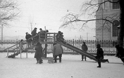 Keywords: Дети на ледяной горке в Румянцевском саду (1959 год).jpg Ледяная го ка в Румянцевском Соловьёвском саду Фото 1959 года Cultural Heritage Russia 7810187004 own 1959 Лук Лукне ович Rumyantsevsky Garden Playground slides