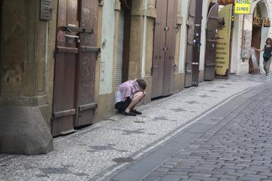 Keywords: Prague in the morning. Man takes a nap. After a long night out?