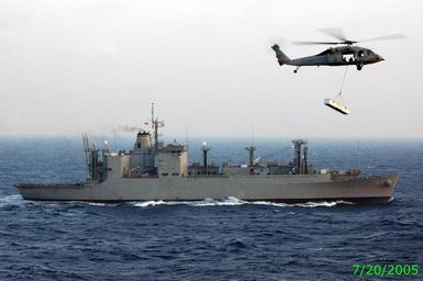 | Keywords: 051129-N-6106R-079.Pacific Ocean (Nov. 29, 2005) – An MH-60S Seahawk helicopter transports supplies from the Military Sealift Command (MSC) ammunition ship USNS Flint (T-AE 32) to the conventionally powered aircraft carrier USS Kitty Hawk (CV 63) during a vertical replenishment. Kitty Hawk and embarked Carrier Air Wing Five (CVW-5) are currently conducting operations in the Western Pacific Ocean. U.S. Navy photo by Photographer's Mate Airman Stephen W. Rowe (RELEASED).. | ||||
