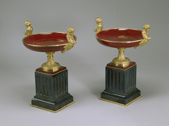Keywords: Imperial Glassworks - Pair of Tazzas - Walters 47415, 47416 - Group.jpg These kylix-shaped bowls are mounted with gilded bronze handles in the form of putti and are borne on feet decorated with acanthus leaves of the same metal Gilded bronze beading has also been applied to the fluted bases of the gray-blue glass The most outstanding feature of these tazzas is the intense sang de boeuf red of the bowls The material is purpurine a dense lead-potash glass containing crystals of cuprous oxide in a clear matrix It is named after porporino a red glass that had been developed by Alessio Matteoli in the Vatican mosaic workshop during the 18th century Leopold Bonafede one of two Italian brothers called to Russia in the mid 1850s by Tsar Nicholas I produced purpurine at the Imperial Glassworks in St Petersburg The earliest documented use of this product was for five of the Imperial Glassworks' six entries at the Paris Exposition Universelle in 1867 After Bonafede's death in 1878 purpurine continued to be made at the factory under the direction of the chief chemist S P Petuchov The Imperial Glassworks supplied Fabergé with purpurine though the jewelry firm developed its own purpurine of a slightly different chemical composition after 1880 late Other date century 19 purpurine gilded bronze colored glass cm 24 13 accession number 47 415 47 416 77444 Alexandre Polovtsoff Aleksandr Aleksandrovich Polovtsov Paris Henry Walters city Baltimore Walters Art Museum Henry Walters Acquired by Henry Walters 1930 place of origin St Petersburg Russia PD-old-auto 1917 Imperial Glassworks Glassware in the Walters Art Museum |