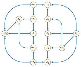 Keywords: Implication graph.svg An implication graph Own 2008-05-02 David Eppstein This graph is formed from the 2-satisfiability instance <math>\scriptstyle x_0\lor x_2 \land x_0\lor\lnot x_3 \land x_1\lor\lnot x_3 \land x_1\lor\lnot x_4 \land x_2\lor\lnot x_4 \land \atop\scriptstyle\quad x_0\lor \lnot x_5 \land x_1\lor\lnot x_5 \land x_2\lor\lnot x_5 \land x_3\lor x_6 \land x_4\lor x_6 \land x_5\lor x_6 </math> by replacing each disjunction by the two implications to which it is equivalent e g <math>\scriptstyle x_0\lor\lnot x_3 \equiv \lnot x_0\Rightarrow\lnot x_3 \equiv x_3\Rightarrow x_0 </math> and then representing the implications graphically as directed edges in a graph The solution set for the same example instance is depicted in Image 2SAT median graph svg Files by User David Eppstein from en wikipedia Graphs with 14 vertices Directed graphs Boolean satisfiability problem