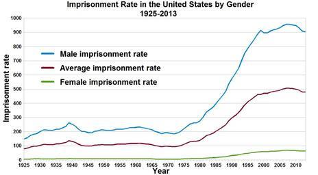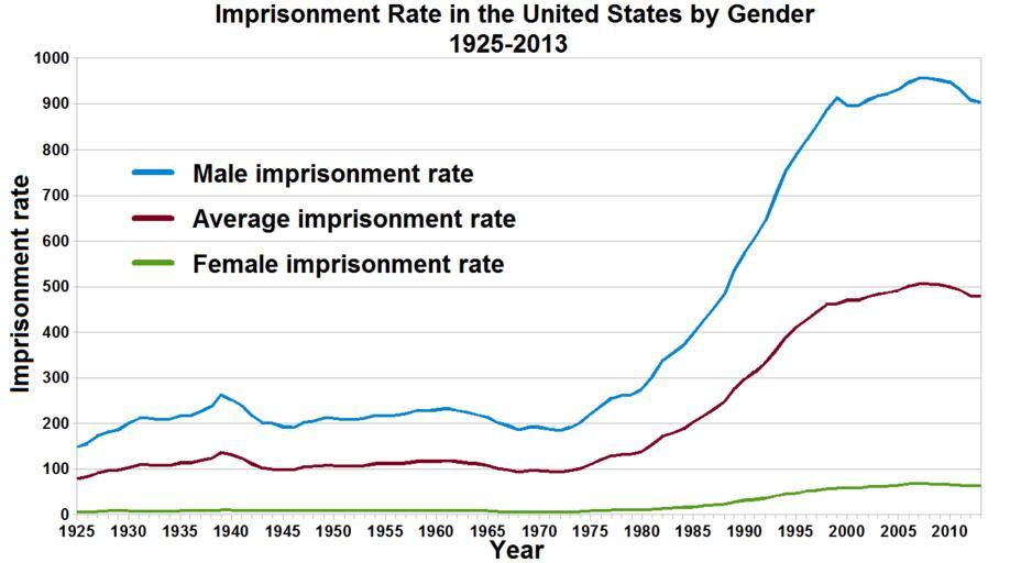 | Keywords: Imprisonment rate in the United States by gender.png en A graph made in Excel 2007 showing the imprisonment rate in the United States by gender sex from 1925 to 2008 Imprisonment rate is defined by the Bureau of Justice Statistics as the number of prisoners sentenced to more than 1 year under state or federal jurisdiction per 100 000 U S residents It does not include jail inmates I created this graph using public domain statistics provided by the United States Bureau of Justice Statistics For the years 1925 - 1999 inclusively the Table 6 28 on page 500 from the Sourcebook of criminal justice statistics 2003 was used It can be found http //www albany edu/sourcebook/index html online at http //www albany edu/sourcebook/pdf/section6 pdf link The sources for that table are as follows U S Department of Justice Bureau of Justice Statistics Prisoners 1925-81 Bulletin NCJ-85861 p 2 Prisoners in 1998 Bulletin NCJ 175687 p 3 Table 3 and p 5 Table 6 2000 Bulletin NCJ 188207 p 5 Table 6; 2001 Bulletin NCJ 195189 p 5 and p 6 Table 7 2002 Bulletin NCJ 200248 p 4 and p 5 Table 5; 2003 Bulletin NCJ 205335 p 4 Washington DC U S Department of Justice and U S Department of Justice Bureau of Justice Statistics Correctional Populations in the United States 1994 NCJ-160091 Tables 1 8 and 1 9; 1997 NCJ 177613 Tables 1 8 and 1 9 Washington DC U S Department of Justice For the years 2000-2011 inclusively the bulletin http //bjs ojp usdoj gov/content/pub/pdf/p11 pdf Prisoners in 2011 NCJ 239808 was used For the imprisonment rates from 2000 to 2011 Table 5 and 6 on page 6 were used For the years 2011-2012 the bulletin http //www bjs gov/content/pub/pdf/p12tar9112 pdf Prisoners in 2012 NCJ 243920 was used For the imprisonment totals Table 17 page 23 was used For the imprisonment rate in 2012 Table 18 from page 25 was used The rate for 2011 used the data from the 2011 report The imprisonment rate from 1980-2000 can also be found at http //bjs ojp usdoj gov/content/glance/tables/incrttab cfm Key facts at a glance which is currently mislabeled as incarceration rate 14 24 7 January 2010 UTC Smallman12q talk File Imprisonment_rate_in_the_United_States_by_gender pdf The table of data from which this graph was made is as follows made using excel2wiki center style background f0f0f0; Year center style background f0f0f0; Total center style background f0f0f0; Average<br/>imprisonment<br/>rate center style background f0f0f0; Male Total center style background f0f0f0; Male<br/>imprisonment<br/>rate center style background f0f0f0; Female Total center style background f0f0f0; Female<br/>imprisonment<br/>rate - 1925 91 669 79 88 231 149 3 438 6 - 1926 97 991 83 94 287 157 3 704 6 - 1927 109 983 91 104 983 173 4 363 7 - 1928 116 390 96 111 836 182 4 554 8 - 1929 120 496 98 115 876 187 4 620 8 - 1930 129 453 104 124 785 200 4 668 8 - 1931 137 082 110 132 638 211 4 444 7 - 1932 137 997 110 133 573 211 4 424 7 - 1933 136 810 109 132 520 209 4 290 7 - 1934 138 316 109 133 769 209 4 547 7 - 1935 144 180 113 139 278 217 4 902 8 - 1936 145 038 113 139 990 217 5 048 8 - 1937 152 741 118 147 375 227 5 366 8 - 1938 160 285 123 154 826 236 5 459 8 - 1939 179 818 137 173 143 263 6 675 10 - 1940 173 706 131 167 345 252 6 361 10 - 1941 165 439 124 159 228 239 6 211 9 - 1942 150 384 112 144 167 217 6 217 9 - 1943 137 220 103 131 054 202 6 166 9 - 1944 132 456 100 126 350 200 6 106 9 - 1945 133 649 98 127 609 193 6 040 9 - 1946 140 079 99 134 075 191 6 004 8 - 1947 151 304 105 144 961 202 6 343 9 - 1948 155 977 106 149 739 205 6 238 8 - 1949 163 749 109 157 663 211 6 086 8 - 1950 166 123 109 160 309 211 5 814 8 - 1951 165 680 107 159 610 208 6 070 8 - 1952 168 233 107 161 994 208 6 239 8 - 1953 173 579 108 166 909 211 6 670 8 - 1954 182 901 112 175 907 218 6 994 8 - 1955 185 780 112 178 655 217 7 125 8 - 1956 189 565 112 182 190 218 7 375 9 - 1957 195 414 113 188 113 221 7 301 8 - 1958 205 643 117 198 208 229 7 435 8 - 1959 208 105 117 200 469 228 7 636 8 - 1960 212 953 117 205 265 230 7 688 8 - 1961 220 149 119 212 268 234 7 881 8 - 1962 218 830 117 210 823 229 8 007 8 - 1963 217 283 114 209 538 225 7 745 8 - 1964 214 336 111 206 632 219 7 704 8 - 1965 210 895 108 203 327 213 7 568 8 - 1966 199 654 102 192 703 201 6 951 7 - 1967 194 896 98 188 661 195 6 235 6 - 1968 187 914 94 182 102 187 5 812 6 - 1969 196 007 97 189 413 192 6 594 6 - 1970 196 429 96 190 794 191 5 635 5 - 1971 198 061 95 191 732 189 6 329 6 - 1972 196 092 93 189 823 185 6 269 6 - 1973 204 211 96 197 523 191 6 004 6 - 1974 218 466 102 211 077 202 7 389 7 - 1975 240 593 111 231 918 220 8 675 8 - 1976 262 833 120 252 794 238 10 039 9 - 1977 285 456 129 274 244 255 11 212 10 - 1978 294 396 132 282 813 261 11 583 10 - 1979 301 470 133 289 465 264 12 005 10 - 1980 315 974 139 303 643 275 12 331 11 - 1981 353 673 154 339 375 304 14 298 12 - 1982 395 516 171 379 075 337 16 441 14 - 1983 419 346 179 401 870 354 17 476 15 - 1984 443 398 188 424 193 370 19 205 16 - 1985 480 568 202 459 223 397 21 345 17 - 1986 522 084 217 497 540 426 24 544 20 - 1987 560 812 231 533 990 453 26 822 22 - 1988 603 732 247 573 587 482 30 145 24 - 1989 680 907 276 643 643 535 37 264 29 - 1990 739 980 297 699 416 575 40 564 32 - 1991 789 610 313 745 808 606 43 802 34 - 1992 846 277 332 799 776 642 46 501 36 - 1993 932 074 359 878 037 698 54 037 41 - 1994 1 016 691 389 956 566 753 60 125 45 - 1995 1 085 022 411 1 021 059 789 63 963 47 - 1996 1 137 722 427 1 068 123 819 69 599 51 - 1997 1 194 581 444 1 120 787 853 73 794 54 - 1998 1 245 402 461 1 167 802 885 77 600 57 - 1999 1 304 074 463 1 221 611 913 82 463 59 - 2000 1 334 174 470 1 249 130 897 85 044 59 - 2001 1 345 217 470 1 260 033 895 85 184 58 - 2002 1 380 516 477 1 291 450 909 89 066 61 - 2003 1 408361 483 1 315 790 917 92 571 62 - 2004 1 433 728 487 1 337 730 923 95 998 64 - 2005 1 462 866 492 1 364 178 932 98 688 65 - 2006 1 504 598 501 1 401 261 948 103 337 68 - 2007 1 532 851 506 1 427 088 955 105 763 69 - 2008 1 547 742 506 1 441 384 956 1