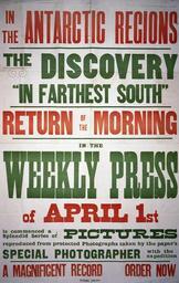 | Keywords: text sign signboard outdoor Arrangement of text in red and green on cream paper. Quantity: 1 colour photo-mechanical print(s) (broadsheet). Physical Description: Colour relief print or letterpress on broadsheet 755 x 509 mm. Christchurch Press Company Ltd. In the Antarctic regions; The 'Discovery' "In farthest south"; Return of the 'Morning' in the Weekly Press of April 1st is commenced a splendid series of pictures reproduced from protected photographs taken by the paper's special photographer with the expedition. A magnificent record; order now. Press Print. [ca 1904].. Ref: Eph-D-ANTARCTICA-1904-01. Alexander Turnbull Library, Wellington, New Zealand. natlib.govt.nz/records/22883784 Arrangement of text in red and green on cream paper. Quantity: 1 colour photo-mechanical print(s) (broadsheet). Physical Description: Colour relief print or letterpress on broadsheet 755 x 509 mm. Christchurch Press Company Ltd. In the Antarctic regions; The 'Discovery' "In farthest south"; Return of the 'Morning' in the Weekly Press of April 1st is commenced a splendid series of pictures reproduced from protected photographs taken by the paper's special photographer with the expedition. A magnificent record; order now. Press Print. [ca 1904].. Ref: Eph-D-ANTARCTICA-1904-01. Alexander Turnbull Library, Wellington, New Zealand. natlib.govt.nz/records/22883784 |