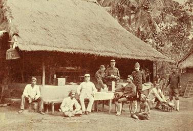 Keywords: In het bivak te Sadeh.jpg en In het bivak te Sadeh Eigen Haard nvt 1898 PD-old Eigen Haard Military bases in the Aceh War Sumatra in the 1890s