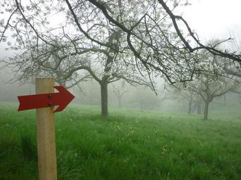 Keywords: in the morning fog nature direction mood fruit trees landscape spring morning mist morning hour silent foggy atmosphere trend setting