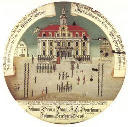 | Keywords: Inbesitznahme der Reichsstadt Hall.jpg en Shooting target from 1802 or 1803 showing Württemberg soldiers parading in front of the town hall of Schwäbisch Hall Württemberg peacefully occupied and annexed that city in 1802 Like nearly all the other free Imperial cities Hall lost its independence in the course of the German mediatization of 1802-1803 <br> de Inbesitznahme der Reichsstadt Hall durch württembergisches Militär Schützenscheibe der Schützenmeister Johann Georg Haag J G Spaehmann und Johann Friedrich Groß zeigt Rathaus und Marktplatz 1802 <br> Inschrift Was Menschen Eigensinn getrent; doch die Natur verband; Dies gab der Genius der Zeit “ dem theuren Vaterland Nicht mit Hochgewitters Stürmen zogen Friedrichs Krieger ein Ihre Losung ist das Streben “ Ihres Herrschers werth zu sein ø 61 5 cm Keckenburgmuseum Schwäbisch Hall Abb 98 in Acht Jahrhunderte Stadtgeschichte - Vergangenheit und Gegenwart im Spiegel der Kommunalarchive in Baden-Württemberg ISBN 3-7995-4036-9 1802 Author Public Domain PD-old-100 History of Schwäbisch Hall 1802 Painted targets |