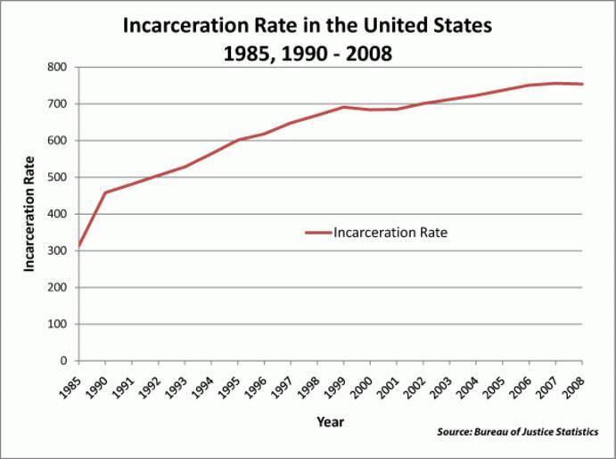 | Keywords: Incarceration Rate in the United States 1985,1990-2008.gif  A graph made in Excel 2007 showing the incarceration rate in the United States from 1985 1990 - 2008 The incarceration rate is defined as the total number of inmates held in custody of state or federal prisons or local jails per 100 000 U S residents http //bjs ojp usdoj gov/content/pub/pdf/p08 pdf p16 It was made using data provided by the Bureau of Justice Statistics en File Incarceration Rate in the United States 1985 1990-2008 png en User Smallman12q created the PNG version of this graph using the following sources For 2000-2008 I used http //bjs ojp usdoj gov/content/pub/pdf/p08 pdf Prisoners in 2008 NCJ 228417 Appendix Table 1 on page 16 For 1985 1990-1999 the data came from http //www albany edu/sourcebook/pdf/section6 pdf section 6 of Sourcebook of criminal justice statistics 2003 page 488 Table 6 13 The sources for that page are as follows Prison and Jail Inmates at Midyear 1998 Bulletin NCJ 173414 Washington DC U S Department of Justice March 1999 p 2 Table 1 U S Department of Justice Bureau of Justice Statistics Prisoners in 2002 Bulletin NCJ 200248 p 2 and 2003 Bulletin NCJ 205335 p 2 Table 1 Washington DC U S Department of Justice 21 55 8 January 2010 UTC - date of original PNG version of the image Smallman12q talk created the PNG version of the graph User Timeshifter converted it to this GIF file en File Incarceration Rate in the United States_1985 1990-2008 pdf The data is as follows made using excel2wiki 1 cellspacing 0 center style background f0f0f0; Year center style background f0f0f0; Incarceration Rate - 1985 313 - 1990 458 - 1991 481 - 1992 505 - 1993 528 - 1994 564 - 1995 601 - 1996 618 - 1997 648 - 1998 669 - 1999 691 - 2000 684 - 2001 685 - 2002 701 - 2003 712 - 2004 723 - 2005 737 - 2006 751 - 2007 756 - 2008 754 - Smallman12q Imprisonment and detention rates in the United States |