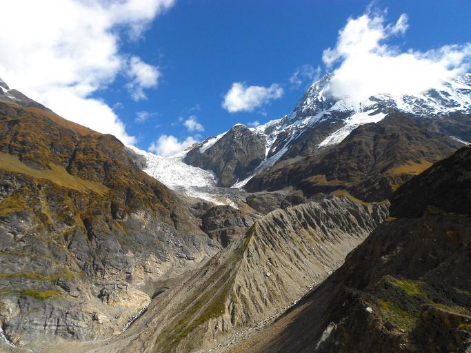 Keywords: india glacier mountains valley ravine gorge sky clouds nature outside remote formations rocks rocky
