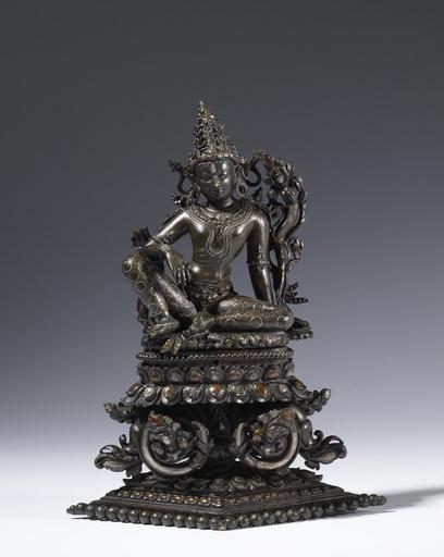 | Keywords: Indian - Bodhisattva Maitreya - Walters 543080.jpg This sumptuous bodhisattva is the future Buddha Maitreya recognizable by the small pot resting on the lotus stem and by the stupa nearly hidden in his elaborate headdress Solid dome-shaped structures called stupas sometimes hold relics of the Buddha Shakyamuni It can be imagined that Maitreya is honoring Shakyamuni by placing his relics on his head Originally the sculpture flanked a statue of Shakyamuni with the bodhisattva Avalokiteshvara on the other side An inscription on the base names the elderly monk Sadhurakshita donor of this image to a monastery century 12 bronze with silver and copper inlay cm 18 4 14 7 6 accession number 54 3080 843 John and Berthe Ford Baltimore date and mode of acquisition unknown Walters Art Museum John Berthe Ford 2009 under base place of origin Bihar India Walters Art Museum license Art of India in the Walters Art Museum Media contributed by the Walters Art Museum needs category review |