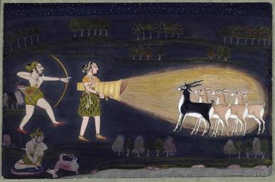| Keywords: Indian - A Deer Hunt - Walters W854.jpg A woman with a giant torch mesmerizes a deer She may not be a member of the Bhil tribe though her skirt resembles a Bhil skirt but a lady of the court indulging in a nocturnal adventure This must have been a memorable event with its own special mood which the court artist was asked to preserve ca 1775 pigments paper cm 16 8 25 6 accession number W 854 1398 Jegdish Mittal Hyderabad India date and mode of acquisition unknown John and Berthe Ford Baltimore date and mode of acquisition unknown Walters Art Museum John Berthe Ford 2000 place of origin Kotah Rajasthan India Walters Art Museum license 2D Paintings of India in the Walters Art Museum Bhil people 1770s paintings from India Hunting in art of India |