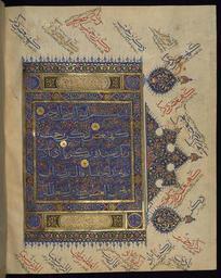 | Keywords: Indian - Double-page Illuminated Incipit - Walters W563274B - Full Page.jpg This folio from Walters manuscript W 563 is the right side of a double-page illuminated incipit introducing chapter 19 Surat Maryam The text is written in gold Muhaqqaq script outlined in black with vocalization in red and counters filled in in red and green The ground is decorated with floral motifs The margins contain various phrases and words with explanations of their readings according to different reciters 9th century AH/AD 15th century Timurid ink and pigments on thin laid paper cm 40 31 accession number W 563 274B 81375 Sultan 'Uthman Khan date and mode of acquisition unknown erased bequest waqf statement and stamp on fol 3a Sultan Bayezid II date and mode of acquisition unknown seal on fol 8a Dikran Kelekian New York and Paris date and mode of acquisition unknown Henry Walters Baltimore date of acquisition unknown by purchase Walters Art Museum Henry Walters Acquired by Henry Walters place of origin northern India Walters Art Museum license 2D Mughal manuscripts in the Walters Art Museum Media contributed by the Walters Art Museum needs category review |