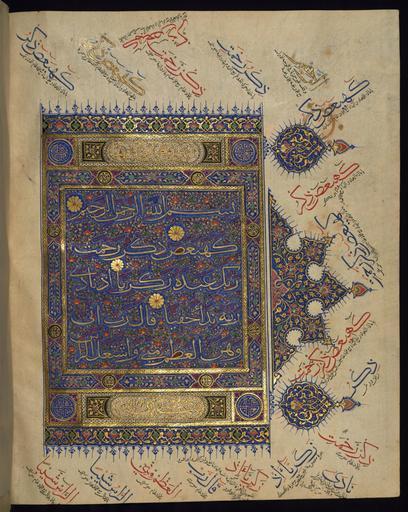 | Keywords: Indian - Double-page Illuminated Incipit - Walters W563274B - Full Page.jpg  This folio from Walters manuscript W 563 is the right side of a double-page illuminated incipit introducing chapter 19 Surat Maryam The text is written in gold Muhaqqaq script outlined in black with vocalization in red and counters filled in in red and green The ground is decorated with floral motifs The margins contain various phrases and words with explanations of their readings according to different reciters 9th century AH/AD 15th century Timurid ink and pigments on thin laid paper cm 40 31 accession number W 563 274B 81375 Sultan 'Uthman Khan date and mode of acquisition unknown erased bequest waqf statement and stamp on fol 3a Sultan Bayezid II date and mode of acquisition unknown seal on fol 8a Dikran Kelekian New York and Paris date and mode of acquisition unknown Henry Walters Baltimore date of acquisition unknown by purchase Walters Art Museum Henry Walters Acquired by Henry Walters place of origin northern India Walters Art Museum license 2D Mughal manuscripts in the Walters Art Museum Media contributed by the Walters Art Museum needs category review |