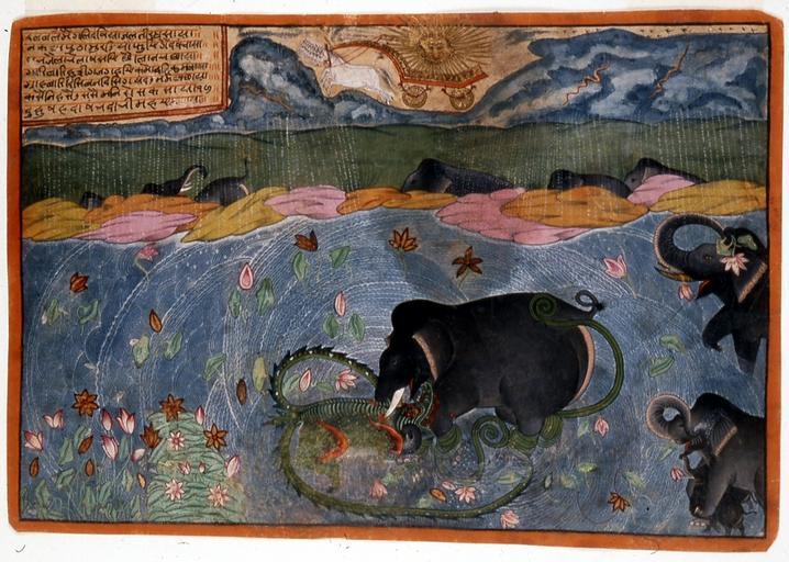 | Keywords: Indian - The Elephant King Attacked by the Crocodile - Walters W887.jpg This picture is from a dispersed Gajendramoksha Liberation of the Elephant-King series The myth's intent like those that tell us of the avatars of Vishnu is to demonstrate Vishnu's willingness always to help when invoked by a person or even an animal with sincere faith Once while a herd of elephants was cavorting in a river their leader was attacked by a crocodile The elephant immediately began calling Vishnu and so intense was the animal's faith that the god appeared on earth and saved him Here an unknown artist has given us an expressive rendering of the vicious attack in a most imaginative manner The elephants are drawn with telling realism but the crocodile is purely a creature of fantasy and is dragon-like in appearance The behavior of the elephants--a mother protects two babies another feeds on lotuses and others amble beyond the shoreline--reveals familiarity with the pachyderm but the water the rocks and the sky are rendered conceptually though with expressiveness Most unusual is the simultaneous depiction of a cloudburst and a sunburst The dark clouds with streaks of lightning send down sheets of rain but they also clear the way for the sun to appear as a golden human head with golden rays riding a chariot drawn by white steeds ca 1650 pigments gold paper cm 30 2 21 1 accession number W 887 4851 John and Berthe Ford Baltimore date and mode of acquisition unknown Walters Art Museum John Berthe Ford 2001 place of origin Ajmer Rajasthan India Walters Art Museum license 2D Hindu art in the Walters Art Museum Media contributed by the Walters Art Museum needs category review Gajendramoksha 17th-century watercolor paintings from India Paintings of elephants Elephants in art of India 1650s paintings from India Paintings of India in the Walters Art Museum |