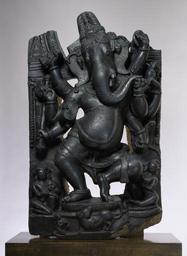 | Keywords: Indian - Ganesha - Walters 2549.jpg Ganesha a son of the supreme god Shiva is the Hindu god worshiped at the start of an endeavor According to Hindu mythology the universe is periodically destroyed when Shiva dances His son Ganesha is a dancer too and like his father he holds a drum At the same time Ganesha with his potbelly and his desire for sweets has a character different from Shiva's Ganesha was originally created by his mother Parvati while his father was absent; when Shiva returned he decapitated Ganesha After Parvati demanded that Shiva replace the child's head servants came back with the head of an elephant 1st half Other date century 11 muscovite biotite schist cm 96 8 58 5 accession number 25 49 6009 J Gilman d'Arcy Paul Baltimore date and mode of acquisition unknown Walters Art Museum Gift of J Gilman d'Arcy Paul 1967 place of origin Bihar India Walters Art Museum license Hindu art in the Walters Art Museum Media contributed by the Walters Art Museum needs category review Dancing Ganesha in sculpture 11th-century art of India Sculptures from Bihar |