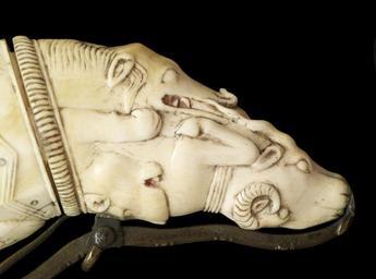 | Keywords: Indian - Powder Flask - Walters 71419 - Detail A.jpg The powder flask also known as a priming flask was an essential firearm accessory and held the fine powder needed to make the gun fire Gunmakers in India during the Mughal era 1526-1858 specialized in carving ivory powder flasks with animal figures Often as these two examples the decoration consists of intertwined and composite creatures that seem to grow out of or attack one another One such menagerie on the right-hand flask includes a cheetah or lion chasing an antelope in the center and bucks antelopes lions birds a boar elephant and mongoose at the two ends Many of these animals were regularly hunted or used for hunts as with the elephant in Mughal India century 18 Early Modern ivory set with amber steel cm 6 2 16 2 2 5 accession number 71 419 40388 Max and Maurice Rosenheim date and mode of acquisition unknown Sale Sotheby's London May 9-11 1923 lot 304 Henry Walters Baltimore 1923 mode of acquisition unknown Walters Art Museum Henry Walters Acquired by Henry Walters 1923 place of origin India Walters Art Museum license Weapons in the Walters Art Museum Indian gunpowder flasks 18th-century ivory Mughal art in the Walters Art Museum Carved ivory objects Ivory sculptures in India |