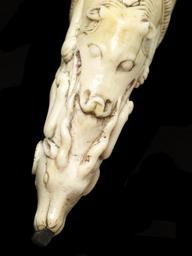 | Keywords: Indian - Powder Flask - Walters 71419 - Detail B.jpg The powder flask also known as a priming flask was an essential firearm accessory and held the fine powder needed to make the gun fire Gunmakers in India during the Mughal era 1526-1858 specialized in carving ivory powder flasks with animal figures Often as these two examples the decoration consists of intertwined and composite creatures that seem to grow out of or attack one another One such menagerie on the right-hand flask includes a cheetah or lion chasing an antelope in the center and bucks antelopes lions birds a boar elephant and mongoose at the two ends Many of these animals were regularly hunted or used for hunts as with the elephant in Mughal India century 18 Early Modern ivory set with amber steel cm 6 2 16 2 2 5 accession number 71 419 40388 Max and Maurice Rosenheim date and mode of acquisition unknown Sale Sotheby's London May 9-11 1923 lot 304 Henry Walters Baltimore 1923 mode of acquisition unknown Walters Art Museum Henry Walters Acquired by Henry Walters 1923 place of origin India Walters Art Museum license Weapons in the Walters Art Museum Indian gunpowder flasks 18th-century ivory Mughal art in the Walters Art Museum Media contributed by the Walters Art Museum needs category review |