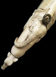| Keywords: Indian - Powder Flask - Walters 71419 - Detail F.jpg The powder flask also known as a priming flask was an essential firearm accessory and held the fine powder needed to make the gun fire Gunmakers in India during the Mughal era 1526-1858 specialized in carving ivory powder flasks with animal figures Often as these two examples the decoration consists of intertwined and composite creatures that seem to grow out of or attack one another One such menagerie on the right-hand flask includes a cheetah or lion chasing an antelope in the center and bucks antelopes lions birds a boar elephant and mongoose at the two ends Many of these animals were regularly hunted or used for hunts as with the elephant in Mughal India century 18 Early Modern ivory set with amber steel cm 6 2 16 2 2 5 accession number 71 419 40388 Max and Maurice Rosenheim date and mode of acquisition unknown Sale Sotheby's London May 9-11 1923 lot 304 Henry Walters Baltimore 1923 mode of acquisition unknown Walters Art Museum Henry Walters Acquired by Henry Walters 1923 place of origin India Walters Art Museum license Weapons in the Walters Art Museum Indian gunpowder flasks Mughal art in the Walters Art Museum Media contributed by the Walters Art Museum needs category review |