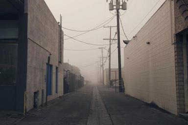 Keywords: industrial alley warehouses pavement concrete power lines posts