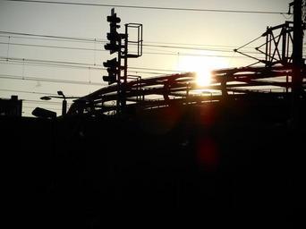 Keywords: industry industry age electricity train power lines energy sun light building black white contrast hell dark sunset sunbeam solar energy mood architecture skyline
