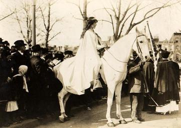 | Keywords: Inez Milholland 1913.jpg Lawyer Inez Boissevain wearing white cape seated on white horse at the National American Woman Suffrage Association parade March 3 1913 Washington D C George Grantham Bain Collection Libary of Congress Reproduction Number http //www loc gov/pictures/item/97510669/ LC-DIG-ppmsc-00031 LOC-image cph 3b24499 1913-03-03 Author <gallery> File Inez Boissevain at the suffrage parade jpg File Inez Milholland 1913 two jpg </gallery> PD-1923 PD-Bain 1913 in the United States Suffragettes Women's suffrage in the United States Washington D C in the 1910s Female equestrians National American Woman Suffrage Association Inez Milholland Woman Suffrage Parade of 1913 |