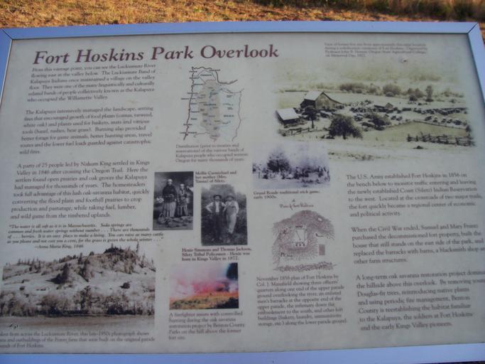 | Keywords: Information Plaque at Fort Hoskins.jpg en Information Plaque at Fort Hoskins in Kings Valley Listed on the National Register of Historic Places Also look for the Photos Fort Hoskins Parking Lot and Shed; Fort Hoskins Grounds; Plaque at Fork Hoskins; Zoomed in Plaque at Fort Hoskins; Fort Hoskins Sight All on the History of Corvallis Oregon Own 46percent History of Corvallis Oregon | ||||