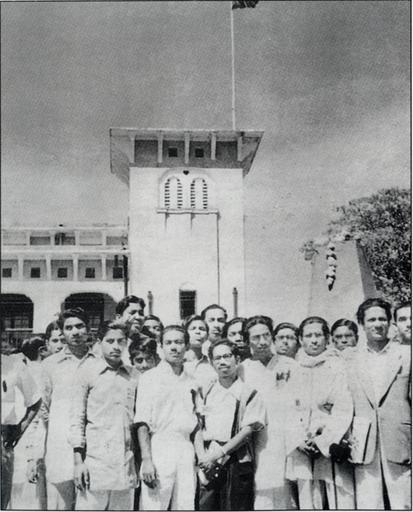 Keywords: Infront of Kola Bhaban 21 Feb 1954.png বাংলা ১৯৫৪ সালের ২১শে ফেব্রুয়ারি কলাভবন শ র্ষে কালো পতাকা উত্তোলনের পর কলাভবন প্রাঙ্গণে নির্মিত শহ দ স্মৃতিস্তম্ভের সামনে ভাষা আন্দোলনের কর্মিগণ ডান দিক থেকে আলাউদ্দিন আল-আ াদ আমানুল হক আহসানুল হক মূর্তা া বশ র হ র রায়হান প্রমুখ ।<br>English 21st February 1954 Language Movement workers in front of foundation stone of the martyrs' monument at old arts faculty building premise after hosting black flag on top of the building From right Alauddin Al-Azad Amanul Hoque Ahsanul Hoque Murtaza Bashir Zahir Raihan others Author's Album 1954-02-21 Prof Rafiqul Islam PD-Pakistan GFDL cc-by-3 0 Photos by Rafiqul Islam |