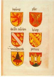 | Keywords: Ingeram Codex 080.jpg Ingeram-Codex der ehemaligen Bibliothek Cotta <br/> happspurg <br/> pfyrt <br/> elsa e ssen ensishein <br/> kyburg <br/> Windischmarck <br/> portnow Portenau Die Wappenbücher Herzog Albrechts VI von Österreich Ingeram-Codex d ehem Bibliothek Cotta; hrsg v Charlotte Becher u Ortwin Gamber; Wien; Köln; Graz; 1986 Jahrbuch der Heraldisch-Genealogischen Gesellschaft Adler; Folge 3 Bd 12 Jg 1984/85; ISBN 3-205-05002-9 1459 Hans Ingeram and a so called Exempla-master Reproduction of a painting that is in the public domain because of its age PD-old-100 Exempla Meister-Albert VI Archduke of Austria Coats of arms of Alsace Coats of arms of the House of Habsburg Coats of arms of Neu-Kyburg family |