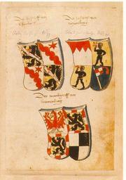 | Keywords: Ingeram Codex 146.jpg Ingeram-Codex der ehemaligen Bibliothek Cotta <br/> Der bysthoff von/Babenberg Bamberg / Anton Rothenhan 1431/59 <br/> Der bysthoff von/wyerzburg/ Johann III Grumbach 1455/66 <br/> Der marckgraff von/brannenburg Brandenburg Die Wappenbücher Herzog Albrechts VI von Österreich Ingeram-Codex d ehem Bibliothek Cotta; hrsg v Charlotte Becher u Ortwin Gamber; Wien; Köln; Graz; 1986 Jahrbuch der Heraldisch-Genealogischen Gesellschaft Adler; Folge 3 Bd 12 Jg 1984/85; ISBN 3-205-05002-9 1459 Hans Ingeram and a so called Exempla-master Reproduction of a painting that is in the public domain because of its age File Xingeram146a JPG File Xingeram146b JPG PD-old-100 Ingeram Codex-Fürspang Derivatives of the Coat of arms of Bamberg diocese Location not applicable Derivatives of the Coat of arms of Grumbach family Derivatives of the Coat of arms of Rotenhan family Derivatives of the Coat of arms of Würzburg diocese Compony bordures in quarterly shields |