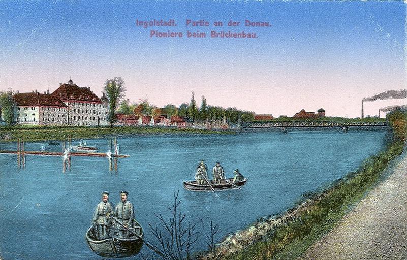 Keywords: Ingolstadt - Pioniere.jpg Ingolstadt Blick auf das linke Donau-Ufer mit der Königlichen Realschule heute Christoph-Scheiner-Gymnasium Im Vordergrund errichten Pioniere eine Behelfsbrücke Ingolstadt view on the left banks of the Danube River with the Königliche Realschule today Christoph-Scheiner-Gymnasium In the foreground sappers are building a temporary brigde Ingolstadt vista sulla riva sinistra del Danubio con la Königliche Realschule oggi Christoph-Scheiner-Gymnasium In primo piano pionieri stanno costruendo un ponte provvisorio Ингольштадт вид на левый бе ег Дуная с Ка олевским еальным училищем ныне Гимназия им К истофа Шейне а а пе вом плане сапе и наводят в еменный мост private collection of Wolfgang Sauber Xenophon ca 1915 Anonymous PD-1923 anonymous-EU Danube in Ingolstadt Christoph-Scheiner-Gymnasium World War I postcards of German Empire Postcards of Ingolstadt Bridges over the Danube in Germany Wooden footbridges in Bavaria Iron truss road bridges in Bavaria Bridges in Ingolstadt