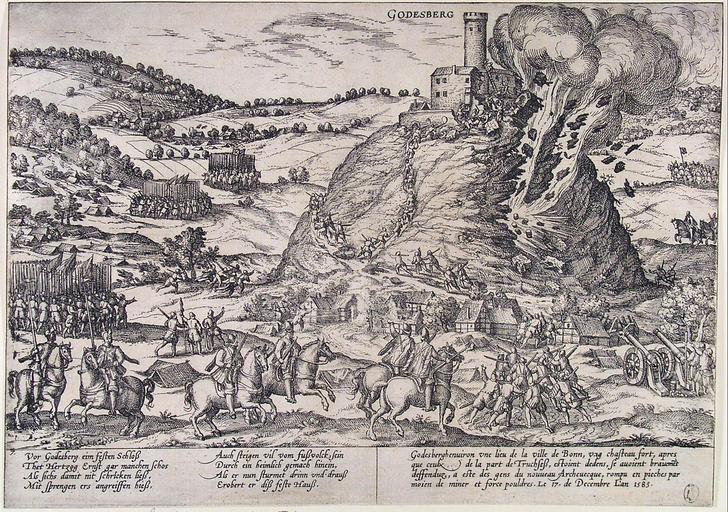 | Keywords: Inname van Godesberg - Capture and destruction of Godesburg in 1583 (Frans Hogenberg).jpg en Capture of Godesberg in 1583 Etching Rotterdam Museum Boijmans Van Beuningen inv no BdH 14487 PK nl Inname van Godesberg uit de Serie historieprenten Ets Rotterdam Museum Boijmans Van Beuningen inv nr BdH 14487 PK Inscriptions / Inscripties GODESBERG 7 Vor Godesberg eim festen Schloß // Thet Hertzog Ernst gar manchen schos // Als sichs damit nit schricken ließ // Mit sprengen ers angreiffen hieß // Auch steigen vil vom fußvolck sein // Durch ein heimlich gemach hinein // Als er nun sturmet drinn und drauß // Erobert er diß feste Hauß Godesbergh enuiron vne lieu de la ville de Bonn vng chasteau fort apres // que ceulx de la part de Truchseß estoient dedens se auoient brauemÄ“t // deffenduz a este des gens du nouueau Archeuecque rompu en pieches par // moien de miner et force pouldres Le 17 de Decembre L ™an 1583 Translation of German inscription At the fortified castle of Godesberg // Duke Ernst fired many shots // When that did not frighten it // He had it attacked with explosives // In addition many of his infantry // Entered through a secret chamber // So when he stormed it from inside and out // He conquered this fortified house Translation of French inscription Godesberg about a league from the city of Bonn a fortified castle after // those inside who were on the side of Truchseß had bravely // defended themselves was broken to pieces by people of the new archbishop // by means of tunnelling and gunpowder The 17th of December in the year 1583 Provenance / Herkomst 1951 bequeathed to the Museum Boijmans Van Beuningen by Dr J C J Bierens de Haan http //www geheugenvannederland nl/ /nl/items/BVB01 BDH14487PK www geheugenvannederland nl Creator Frans Hogenberg ± 1583-1590 Inname van Godesberg - Capture and destruction of Godesburg in 1583 Frans Hogenberg upsampled and noise-reduced jpg Inname van Godesberg - Capture and destruction of Godesburg in 1583 Frans Hogenberg Edit2 jpg Inname van Godesberg - Capture and destruction of Godesburg in 1583 Frans Hogenberg Edit 3 jpg PD-old-100 Siege of Godesberg 1583 Frans Hogenberg Prints in the Museum Boijmans Van Beuningen Hogenberg Frans Engravings of castles in North Rhine-Westphalia |