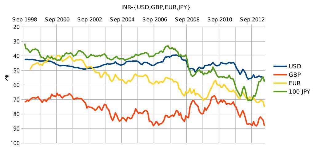 | Keywords: INR-USD,GBP,EUR,JPY.svg en Graph of monthly average exchange rates of Indian rupee INR per 1 USD 1 GBP 1 EUR 100 JPY from September 1998 to May 2013 Created using LibreOffice Calc Data source http //dbie rbi org in/DBIE/dbie rbi site home Reserve Bank of India Reference rate self 2013-06-14 Rupee India |