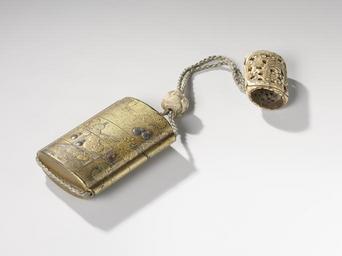 | Keywords: Inro met kalebasplant, netsuke met feniks, ojime met jongen en maan-Rijksmuseum AK-MAK-1497.jpeg accession number AK-MAK-1497 Anonymous credit line GWToolset Rijksmuseum nl Inro met netsuke en ojime De vijfdelige inro is gedecoreerd met kalebasplanten in takamakie op een met goud besprenkelde ondergrond; de kalebassen gedeeltelijk in zilver en een hek in parelmoer zijn ingelegd De netsuke is gedecoreerd met een phoenix; de ojime is gesneden tot een klein jongetje dat naar de maan kijkt de netsuke en ojime zijn later toegevoegd Label Line Japan 18de eeuw hout lak ivoor goud zilver en Inro with netsuke and ojime The five-part inro is decorated with gourd plants in takamakie on a surface sprinkled with gold; the gourds partly in silver and a gate in pearl are inlaid The netsuke is decorated with a phoenix; the ojime is cut to a little boy who looks at the moon The netsuke and ojime added later inro Height cm 6 5 netsuke Height cm 3 6 ojime Diameter cm 1 5 exhibition history Institution Rijksmuseum lacquer ; wood ; bone ; mother of pearl ; gold ; silver object history Acquisition 1996 object type inro PD-US PD-old Data and photography rights All data and all images made available through the API are either in the public domain or are subject to a CC0 license https //www rijksmuseum nl/en/api/terms-and-conditions-of-use cc-zero place of creation Japan http //www rijksmuseum nl/collectie/AK-MAK-1497 http //hdl handle net/10934/RM0001 COLLECT 336542 handle Inro met kalebasplant netsuke met feniks ojime met jongen en maan Uploaded with GWToolset Rijksmuseum AK-MAK-1497 http //www rijksmuseum nl/media/assets/AK-MAK-1497 Images uploaded by Fæ Art of Japan in the Rijksmuseum Images from the Rijksmuseum Inro |