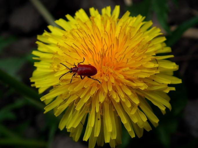 Keywords: insect beetle flower dandelion yellow red bright orange summer flowers summer flowers macro nature petals petal pollen
