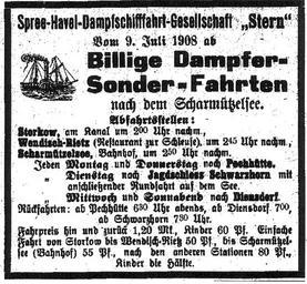 | Keywords: Inserat Stern Dampfschiffahrt 1908.jpg Anzeige der Spree-Havel-Dampfschiffahrt-Gesellschaft-Stern Vorgängergesellschaft der Stern und Kreisschiffahrt Berlin und der Weissen Flotte Potsdam über Dampferfahrten im Jahr 1908 vom Storkower Kanal über Wendisch Rietz zum Scharmützelsee im Landkreis Oder-Spree in Brandenburg Die in der Anzeige erwähnte Pechhütte war eine ehemalige Verladestation für das im Wald gewonnene Pech am heutigen Hafen Bad Saarow in Bad Saarow-Mitte später Restaurant Pechhütte Das erwähnte Jagdschloss Schwarzhorn wurde zur Jahrhundertwende 1900/01 in Wendisch Rietz als Hotel und Restaurant errichtet und ist mit Stand 2014 eine Ruine Advertisement of the shipping company Spree-Havel-Dampfschiffahrt-Gesellschaft-Stern predecessor company of Stern und Kreisschiffahrt Berlin and Weisse Flotte Potsdam from 1908 about steamboat trips from the Storkower Kanal via Wendisch Rietz to the Scharmützelsee District Oder-Spree Brandenburg Germany Amtliches Kreisblatt für den Kreis Beeskow-Storkow Wiedergegeben aus Hans Werner Hintze Zusammenstellung und Herausgabe Saarow-Pieskow vor 100 Jahren in der Kreiszeitung Entstehung der Villenkolonie Bau der Kreisbahn und sonstiges Geschehen Hefte zur Ortsgeschichte von Bad Saarow Heft 48 Alt-Golm 2008 S 13 1908-07-09 Author Stern und Kreisschiffahrt Weiße Flotte Potsdam Scharmützelsee Storkower Kanal Diensdorf-Radlow Wendisch Rietz Bad Saarow Steamships of Germany 1908 advertisements Newspaper clippings Newspaper advertising Advertisements in Brandenburg Shipping line advertisements Steamboat advertising PD-old |