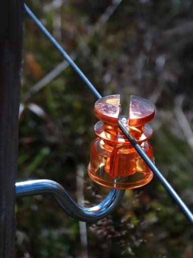 Keywords: insulator cow fence cow wire fencing isolated shielding barrier fenced screw-in fixed clamped orange metal shiny transparent mount protection wiry