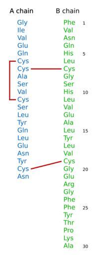 Keywords: Insulin seq vertical.svg en Amino acid sequence of bovine insulin using 3 letter code and showing the disulfide bridges Sequence down the page Drawn using Adobe Illustrator CS5 own Aa77zz 2010-10-20 Insulin 3 letters
