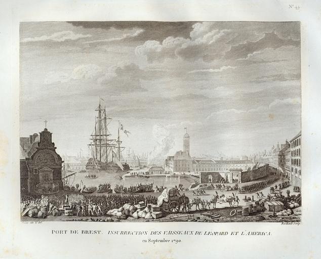 | Keywords: Insurrection des vaisseaux de Léopard et l'America.jpg fr Port de Brest Insurrection des vaisseaux de Léopard et l'America en septembre 1790 http //hdl handle net/1920/5750 1804 Pierre-Gabriel Berthault PD-old-100 Pierre Gabriel Berthault Collection complète des tableaux historiques de la Révolution française 44 |