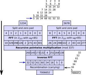 | Keywords: Integer multiplication by FFT.svg en A demonstration of an integer multiplication based on fast Fourier transforms FFTs using a number theoretic transform in the finite field of order 337 choosing 85 as an 8th root of unity since the input vectors are of length 8 Base 10 is used normally a power of 2 would used but 10 is convenient for demonstration and this technique is overkill for integers of this size long multiplication would be superior Because the inputs have 4 digits and the maximum product of two digits in base 10 is 9<sup>2</sup> the base was chosen as the first prime p greater than 4×9<sup>2</sup> 324 where 8 is invertible in the integers modulo p in this example any suitable base > 61 such as 73 would suffice but we don't know that a priori The computation at the top shows how the same acyclic convolution can be computed naively by long multiplication without carrying showing the relationship to multiplication The computation in the lower right shows recombination/carrying of the result vector by decimal shifts and adds to obtain the final integer result Note that all recursive multiplications are of smaller 3-digit integers Values are all accurate and were computed using the following Mathematica code <pre> NTTx_ b_ r_ TableModSumxn + 1 PowerModr k n b n 0 Lengthx - 1 b k 0 Lengthx - 1 INTTx_ b_ r_ Block ninverse ninverse PowerModLengthx -1 b; TableMod ninverse Sumxn + 1 PowerModr Lengthx - n k b n 0 Lengthx - 1 b k 0 Lengthx - 1 x 4 3 2 1 0 0 0 0 ; y 8 7 6 5 0 0 0 0 ; b 337; r 85; NTTx b r NTTy b r ModNTTx b r NTTy b r b INTTModNTTx b r NTTy b r b b r 1234 5678 </pre> 2011-12-17 own Dcoetzee cc-zero Uploaded with UploadWizard Multiplication |