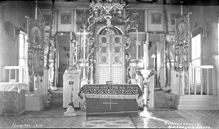 | Keywords: Interior of Church of St Peter and St Paul, Russian Orthodox church at Nushagak, ca 1912 (THWAITES 227).jpeg check categories 27 October 2016 2 Photograph Creator John E Thwaites Caption on image Russian Church Nushagak Alaska PH Coll 247 319 Subjects LCTGM Orthodox churches--Alaska--Nushagak; Interiors--Alaska--Nushagak; Russian Orthodox Greek Catholic Church of America--Facilities--Alaska--Nushagak Subjects LCSH Church decoration and ornament--Alaska--Nushagak depicted place United States--Alaska--Nushagak ca 1912 Institution University of Washington UWASH-THWAITES-source accession number thwaites 227 PD-old-auto-1923 1940 Information field Order Number THW160 Images from the John E Thwaites Photographs of Alaska Collection to check Orthodox churches Interiors |
