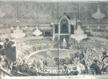 | Keywords: Interior of the New Ciniselli Circus WDL11982.png Artwork ru Шамот С fr Chamotte S en Chamotte S zh S·查莫特 pt Chamotte S ar شاموت، أس es Chamotte S ru Инте ье нового ци ка Чинизелли fr Intérieur du nouveau Cirque Ciniselli en Interior of the New Ciniselli Circus zh 新成立的奇尼塞利马戏团的内部样貌 pt Interior do Novo Circo Ciniselli ar الجزء الداخلي من سيرك تشينزيلي الجديد ru а этой литог афии 1878 года изоб ажен инте ье ци ка Чинизелли в настоящее в емя Большой санкт-пете бу гский госуда ственный ци к отк ытие кото ого состоялось 26 декаб я 1877 года Офо мление з ительного зала было оскошным алиновый ба хат к есел дополнялся золотой отделкой зе калами и х устальными люст ами Купол был пок ыт полотном с цветочными узо ами и изоб ажением выступающих наездников Ложи и места в па те е были ассчитаны на 1 500 человек а общее число з ителей в зале за счет вместительной гале ки могло составить 5 000 человек Особенности здания позволяли использовать в п едставлениях азличные технические новшества ап име в каждом сезоне з ители ци ка Чинизелли могли увидеть з елищную пантомиму к асивый фее ический спектакль в частности включавший впечатляющую батальную сцену с участием пеших и конных войск П оект здания был аз аботан усским а хитекто ом Василием Кенелем 1834 1893 гг Данная литог афия была создана А Зубчаниновым на основе исунка С Шамота <br>Ак обатика; А ены; Ци к; Ци к Чинизелли; Ци ковые а тисты; А тисты; Искусство ве ховой езды; аблюдатели fr Cette lithographie de 1878 montre l'intérieur du Cirque Ciniselli aujourd'hui le Cirque d'État Bolchoï de Saint-Pétersbourg qui ouvrit ses portes le 26 décembre 1877 Le décor luxueux de l'auditorium était notamment composé de dorures de miroirs et de chandeliers en cristal mettant en valeur les fauteuils en velours cramoisi Le dôme était recouvert d'une toile décorée de motifs à fleurs et de scènes équestres Les loges et le parterre comportaient 1 500 places assises mais l'auditorium était conçu pour accueillir jusqu'à 5 000 personnes en comptant les places debout Les caractéristiques du bâtiment permirent d'utiliser plusieurs nouveautés techniques pendant les représentations Par exemple le Cirque Ciniselli présentait chaque saison une pantomime sensationnelle ou spectacle grandiose comme une scène de bataille impressionnante avec des troupes à pied et à cheval Le bâtiment fut créé par l'architecte russe Vasily Kenel 1834 1893 La lithographie fut gravée par A Zubchaninov basée sur un dessin de S Chamotte <br>Acrobaties; Arènes; Cirque; Cirque Ciniselli; Artistes de cirque; Artistes; Équitation; Spectateurs en This lithograph of 1878 shows the interior of the Ciniselli Circus now the Bolshoi Saint Petersburg State Circus which opened on December 26 1877 The decor of the auditorium of the circus was luxurious The crimson velvet of the armchairs was complemented by gold mirrors and crystal chandeliers The dome was covered with canvas showing floral ornaments and equestrian scenes The boxes and stalls could seat 1 500 people but the auditorium was designed to accommodate up to 5 000 people by using the spacious standing gallery The features of the building allowed for various technical novelties used in performances Every season of the Ciniselli Circus included a spectacular pantomime a performance in which a beautiful extravaganza was arranged to show for example an impressive battle scene involving foot and mounted troops The building was designed by Russian architect Vasily Kenel 1834 93 This lithograph was engraved by A Zubchaninov based on a drawing by S Chamotte <br>Acrobatics; Arenas; Circus; Circus Ciniselli; Circus performers; Entertainers; Horsemanship; Spectators zh 这幅 1878 年的石版画展示了奇尼塞利马戏团(即现 的 彼得堡国家大马戏团)的内部样貌,该马戏团于 1877 年 12 26 日 幕 马戏团表演厅的装饰十分华丽 黄金装饰 子和水晶吊灯衬托 深红色天鹅绒的扶手座椅 穹顶上覆盖 描绘 花饰和骑马 景的油画 包厢和正厅前座能 1 500 人,但是 过利用宽敞的站票长廊,整个表演厅设计为 多可容纳 5 000 人 这座建筑的特点允许 表演中使用各种新奇 例如,奇尼塞利马戏团的每 季演出都包含 壮观的哑剧,这次演出会编排 盛大的表演,例如 撼人心的步兵和骑兵齐上阵的战争 该建筑由俄罗斯建筑师瓦西里·克奈尔 Vasily Kenel,1834 1893 年 设计 这幅石版画是 A·祖布恰尼诺夫 A Zubchaninov 基于 S·查莫特(S Chamotte)的 幅画 雕刻 成 <br> ; 竞 及表演 ; 马戏团; 奇尼塞利马戏团; 马戏团表演 ; 艺人; 马 ; 观 pt Esta litografia de 1878 mostra o interior do Circo Ciniselli hoje o Circo Bolshói de São Petersburgo que foi aberto no dia 26 de dezembro de 1877 A decoração luxuosa do auditório foi especialmente composta de espelhos ouro e lustres de cristal destacando poltronas de veludo carmesim O domo estava coberto por telas que mostravam ornamentos florais e cenas equestres Os camarotes e cabin